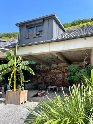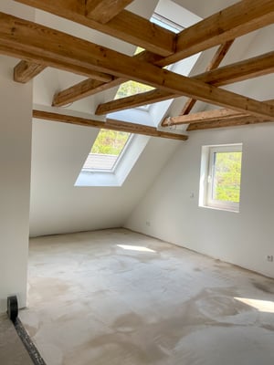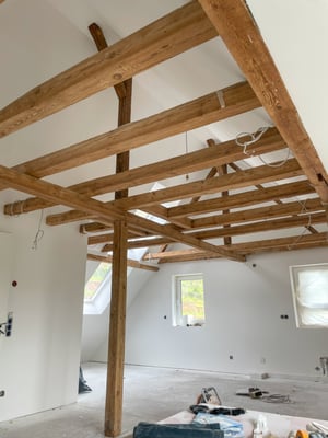 Durch Umnutzung des Heubodens und der darunterliegenden Hofüberdachung entstehen zusätzliche 250 m2 Wohnfläche im Loft Stil.